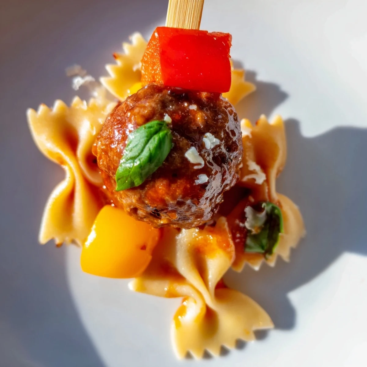 These playful skewers bring together al dente bowtie pasta and tender cocktail meatballs in a handheld format that's perfect for gatherings. The assembly layers vibrant red and yellow bell peppers with sweet grape tomatoes, creating an eye-catching presentation that tastes as good as it looks. A warm glaze of barbecue sauce or marinara with honey and Italian seasoning ties everything together, while fresh basil and Parmesan add the finishing touches.