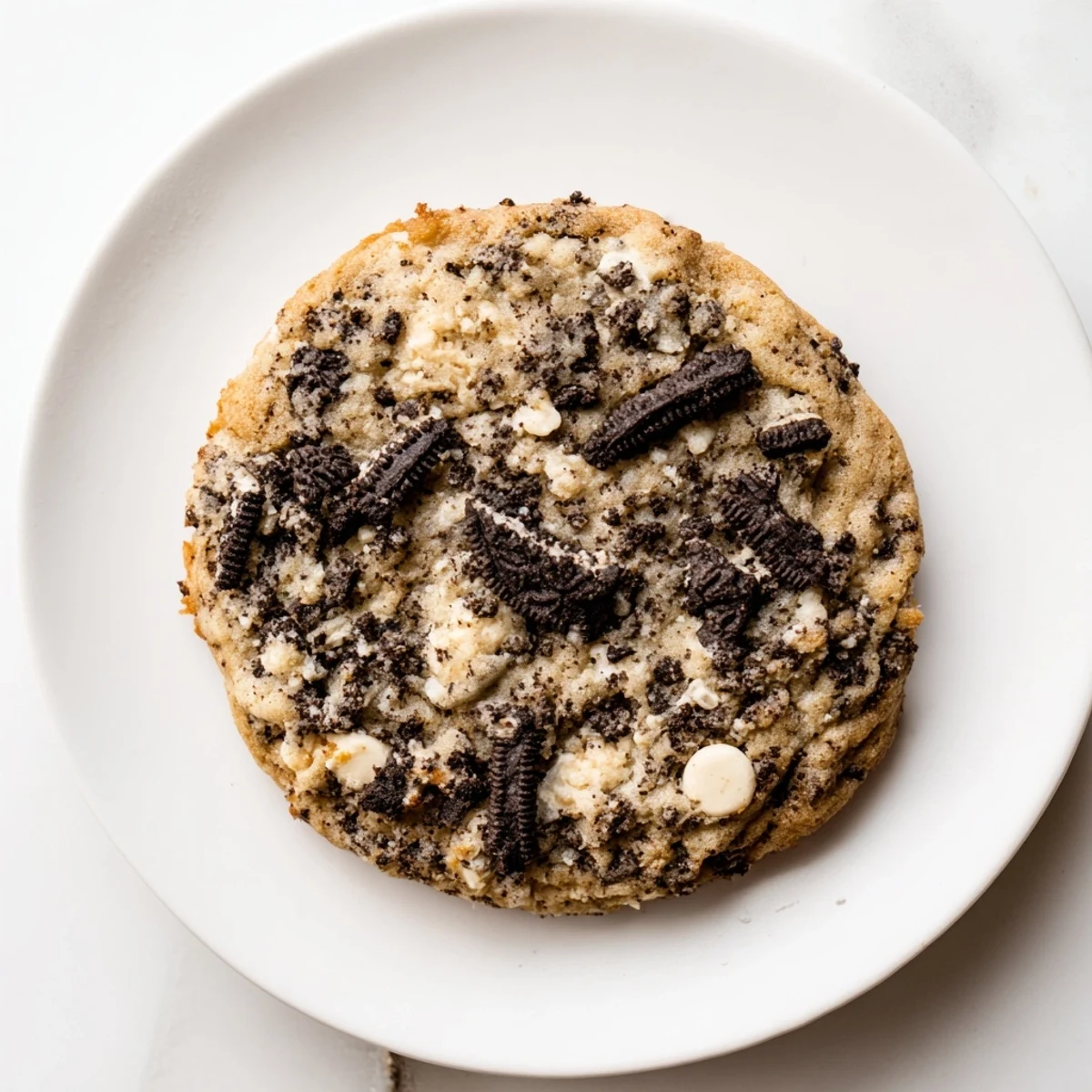 These soft, chewy baked treats combine crushed chocolate sandwich cookies with creamy white chocolate chips throughout a buttery vanilla dough. Each bite delivers the beloved cookies 'n cream experience with crunchy cookie pieces and smooth white chocolate.