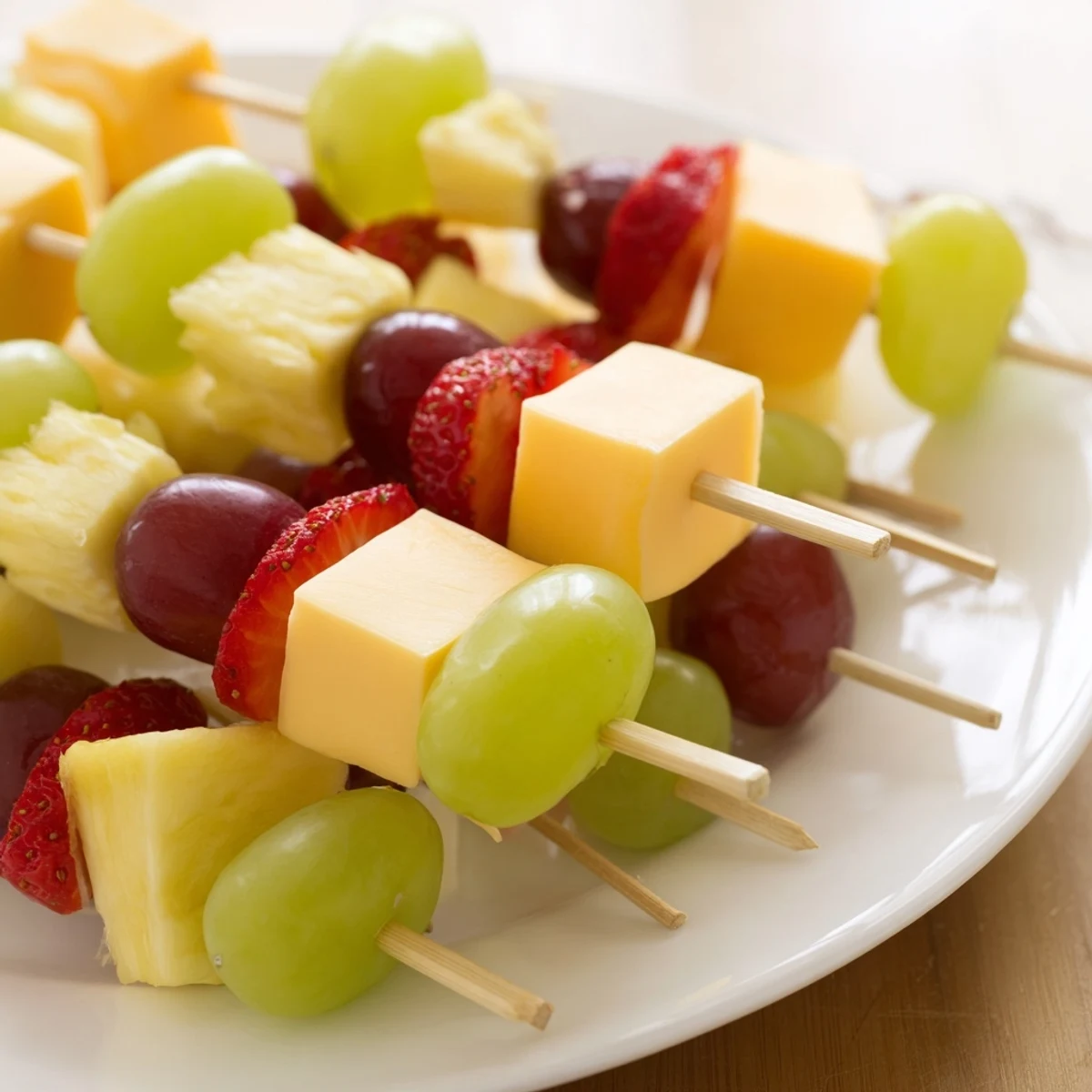 Cantaloupe and honeydew melon pair beautifully with sharp cheeses. Firm fruits like kiwi, apple slices (tossed in lemon juice), and firm pear chunks also work wonderfully. For a savory twist, try adding grape tomatoes or cucumber slices between the cheese and fruit.